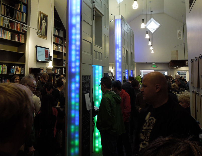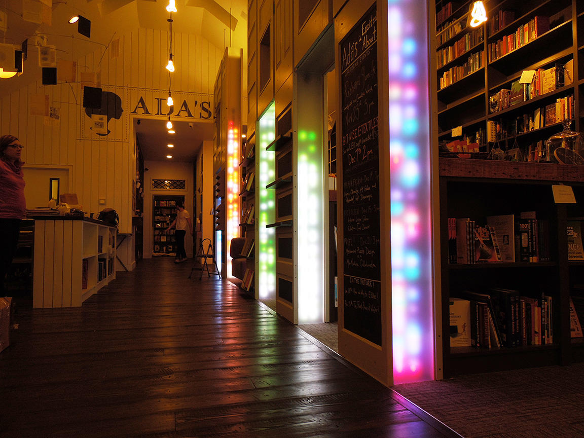 LED installation at Ada’s Technical Books, using repurposed doors from the building’s original interior.