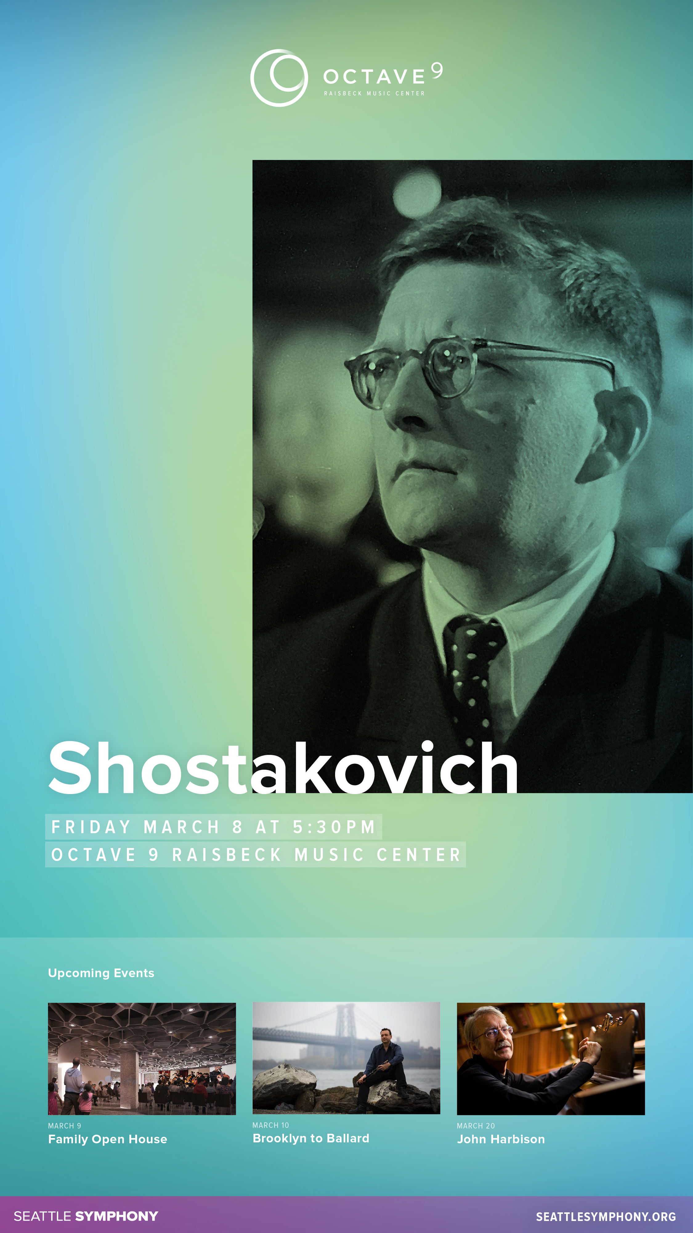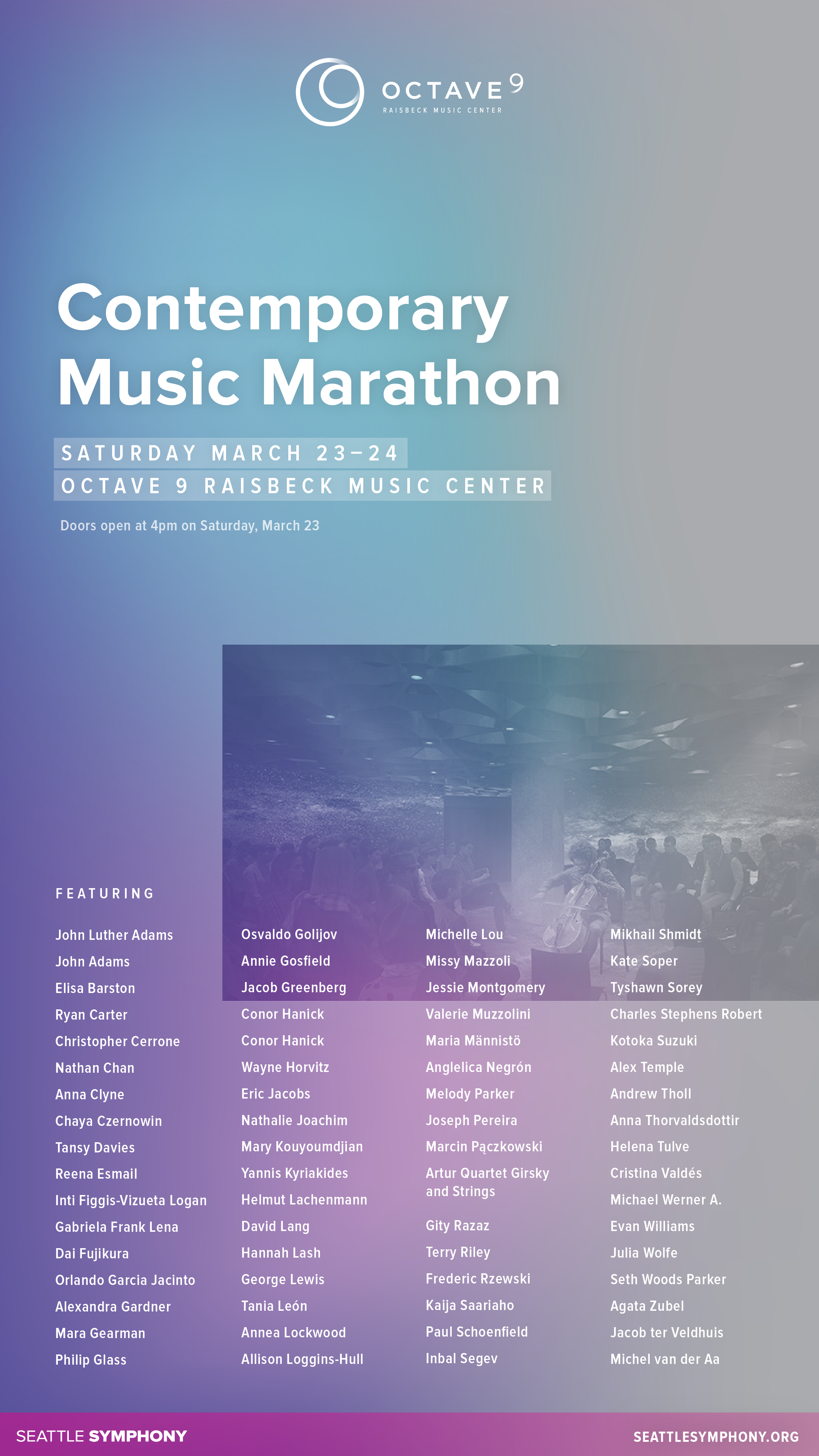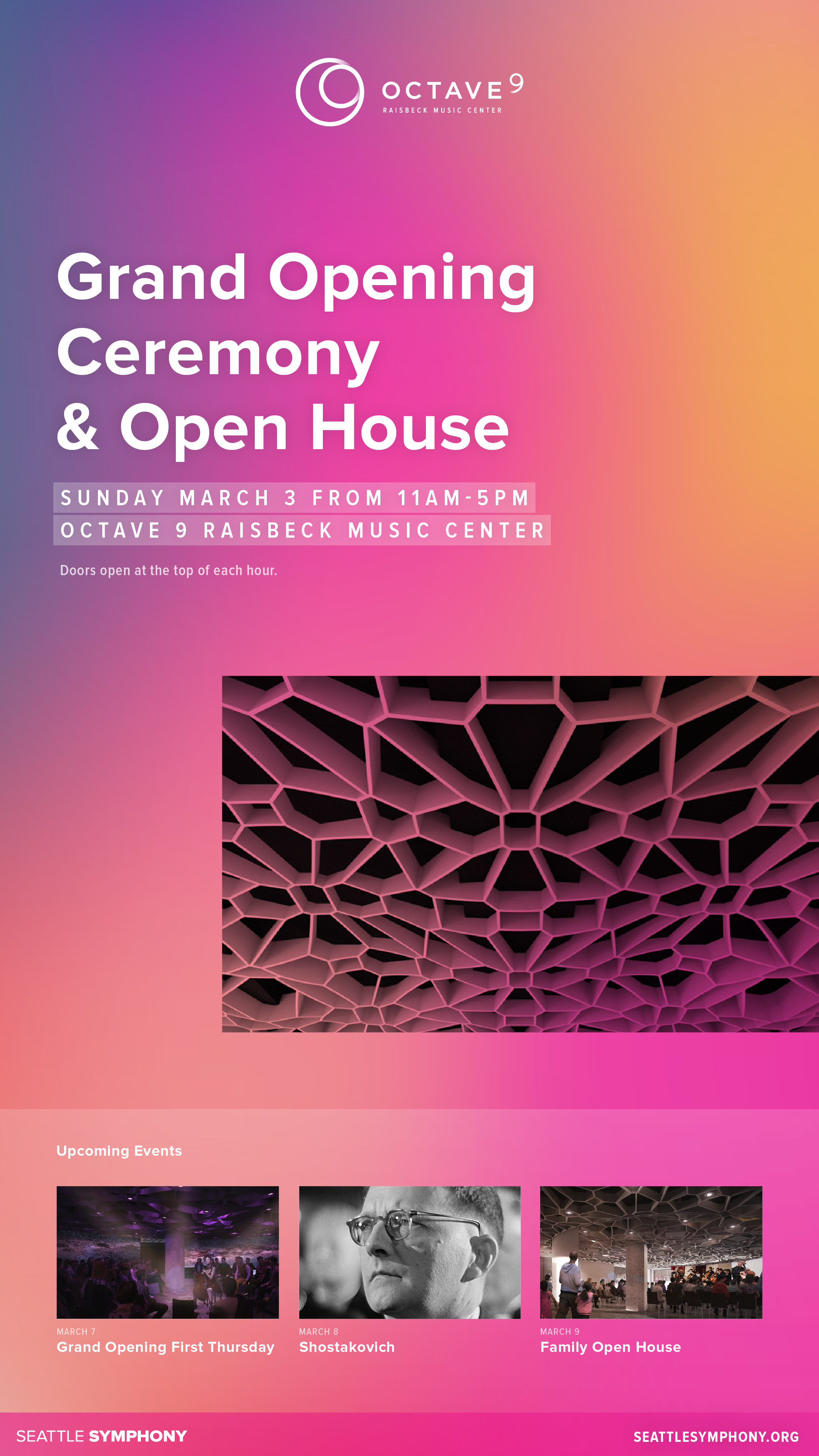 This dynamic digital signage uses color and animation to draw attention to events happening within the Octave 9 performance space.