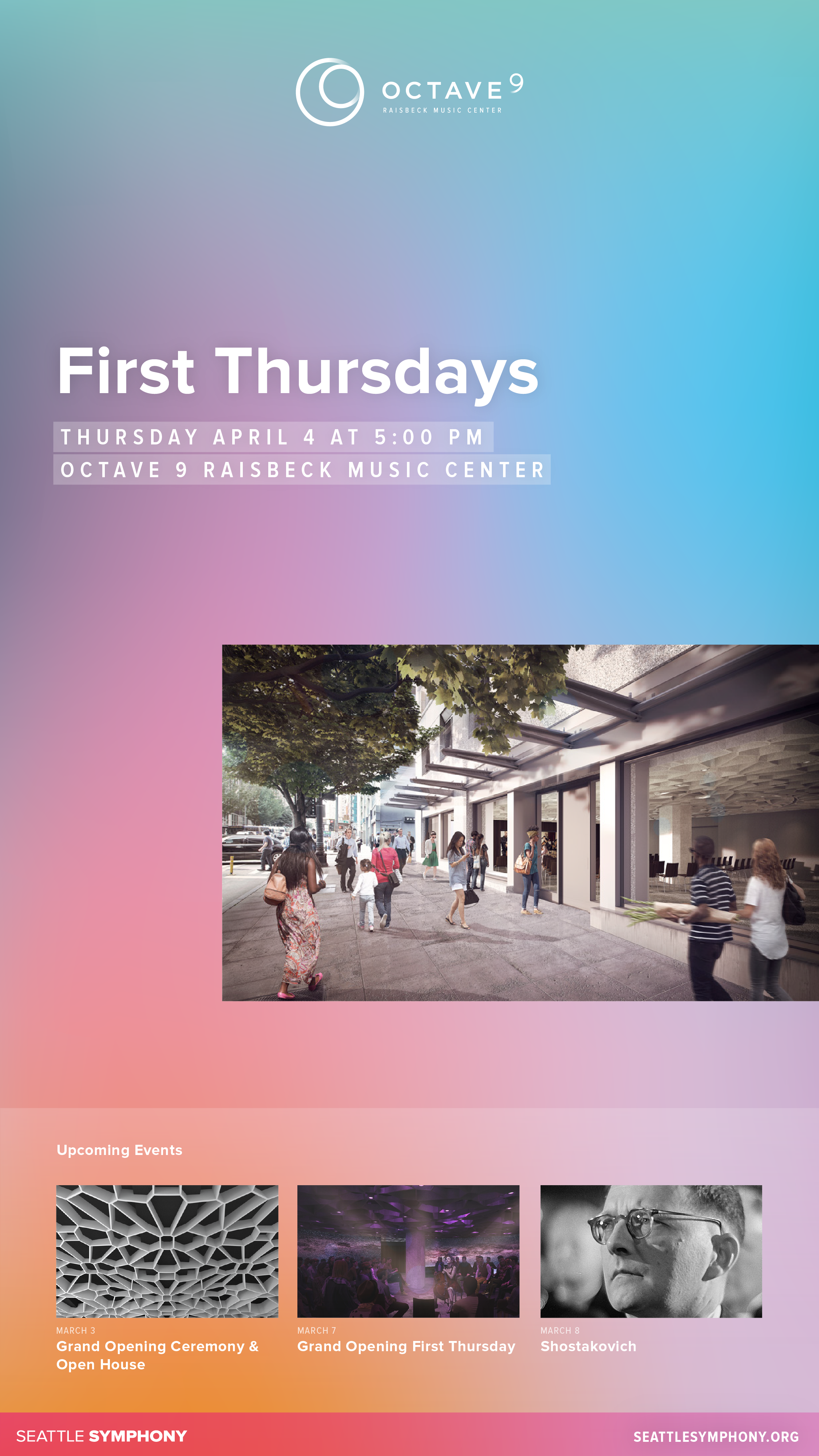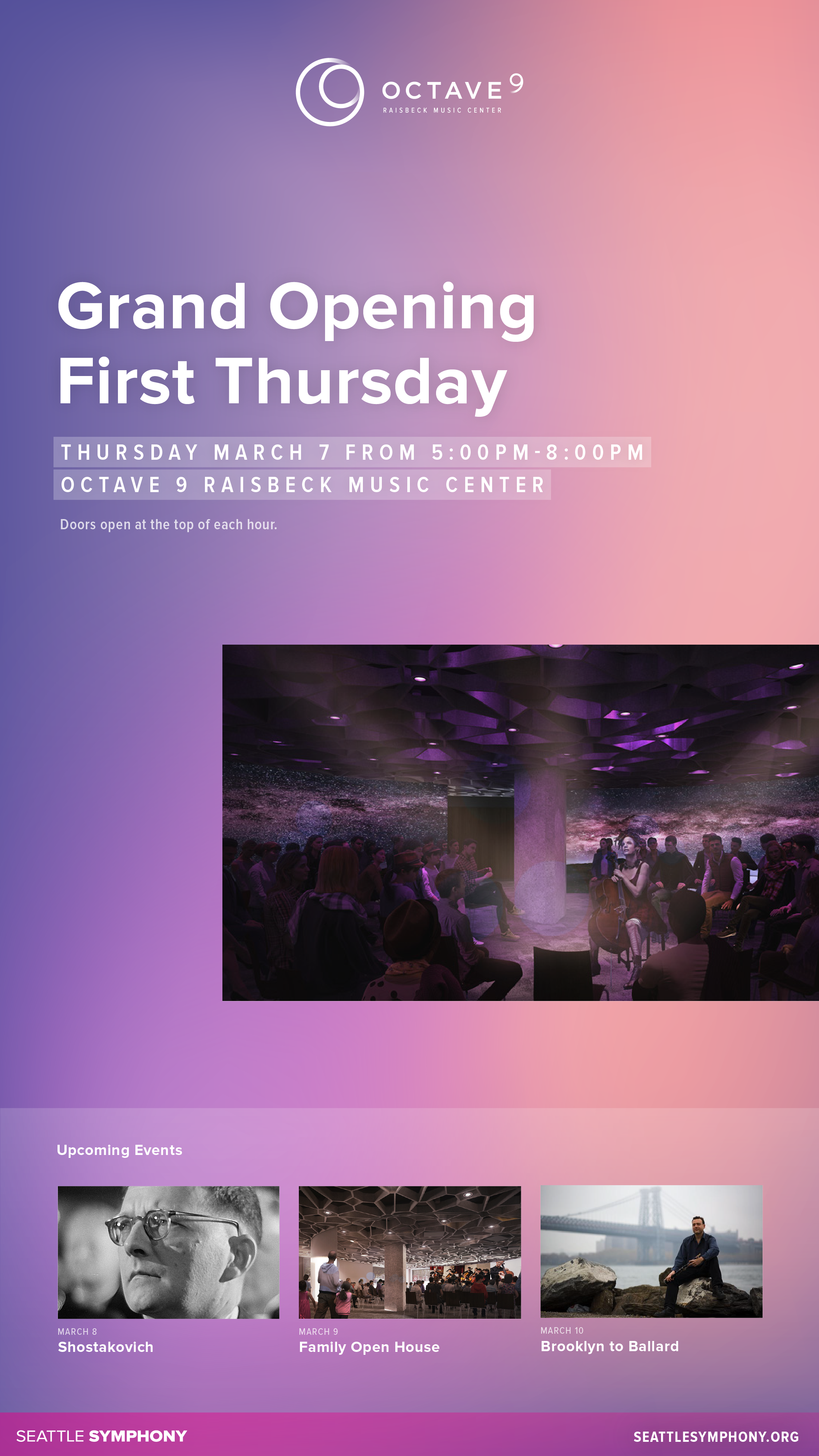 This dynamic digital signage uses color and animation to draw attention to events happening within the Octave 9 performance space.