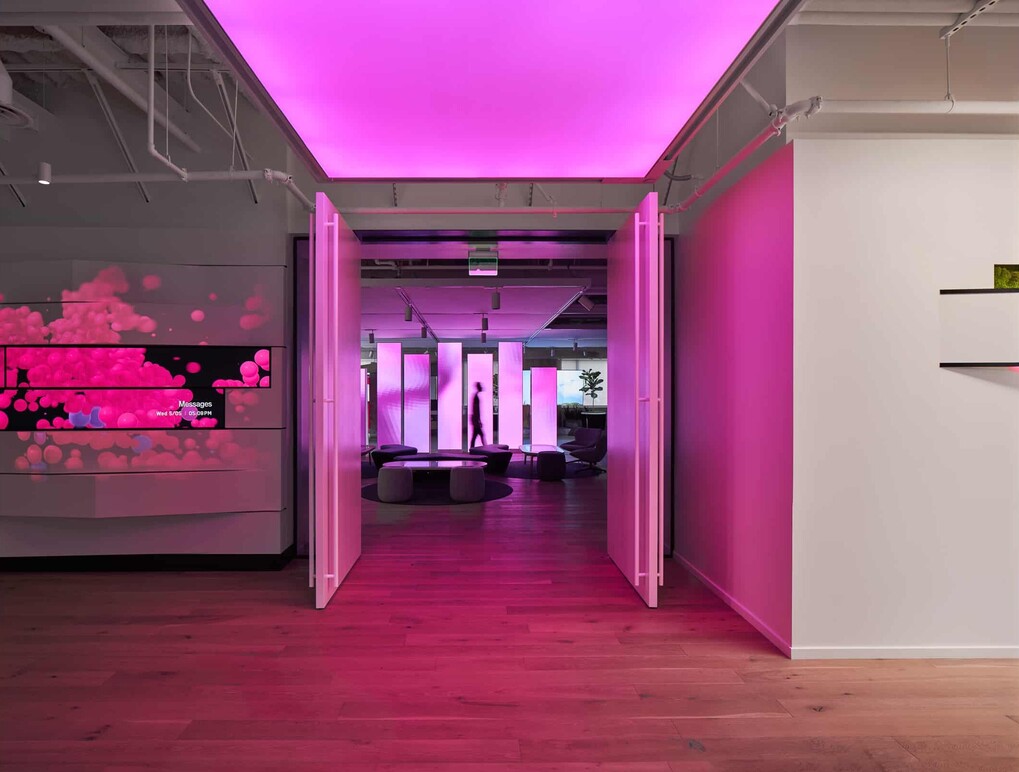 Located at the T-Mobile 5G & Me Innovation Center, this responsive sculpture welcomes visitors as they arrive. Sensors detect when a guest approaches the sculpture, then the guest is prompted to take a picture. The continuous, colorful animation conveys a sense of calm.